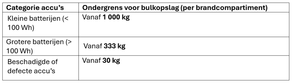 Logistieke bedrijven die veel accu’s in bulk opslaan, krijgen te maken met zwaardere eisen. Met bulkopslag bedoelen we: het opslaan van meerdere losse lithium-ion accu’s of accupakketten, vaak als voorraad of wisselaccu’s, en dus niet het opladen van de accu die in een heftruck of palletwagen zit.